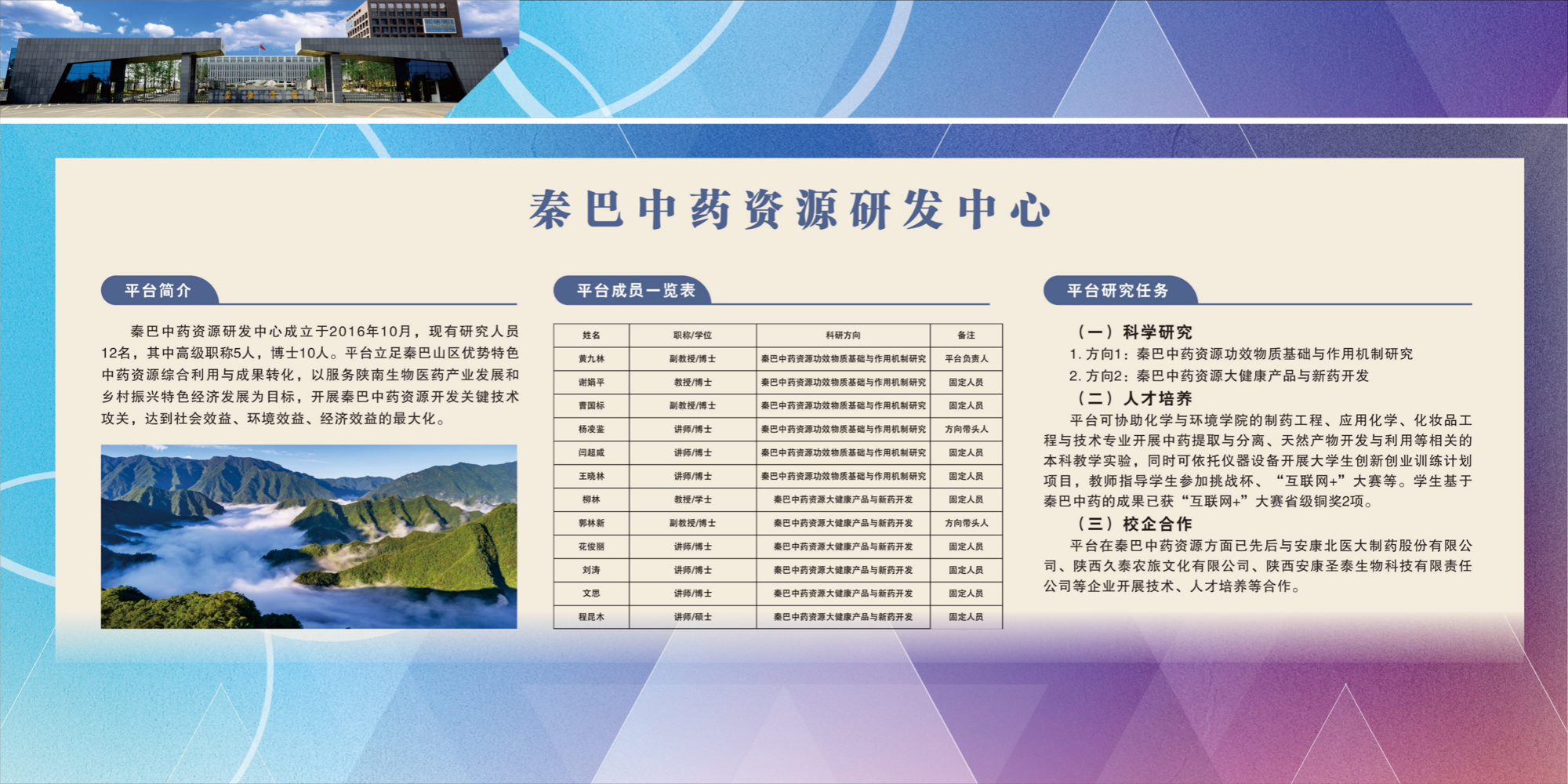 团队依托陕西省安康GAP工程技术研究中心、365英国上市公司官网365上市集团官网实验中心和365英国上市公司官网秦巴中药资源研发中心,主要解决秦巴中药资源开发与利用过程中涉及到的关键技术和问题,为区域经济发展和制药产业人才培养做出了突出贡献。