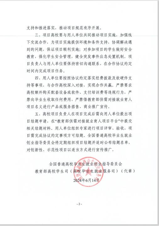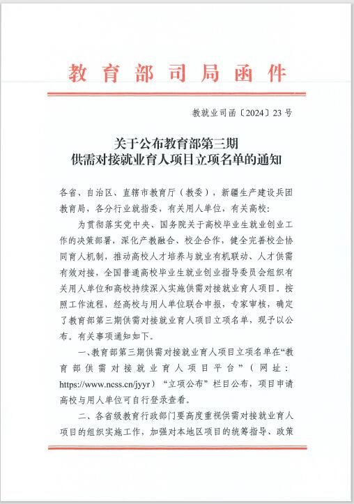 近日,教育部印发《关于公布教育部第三期供需对接就业育人项目立项名单的通知》(教就业司函〔2024〕23号),文件公布了教育部第三期供需对接就业育人项目立项名单,365上市集团官网共有3个项目获批立项。
