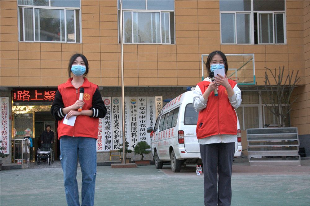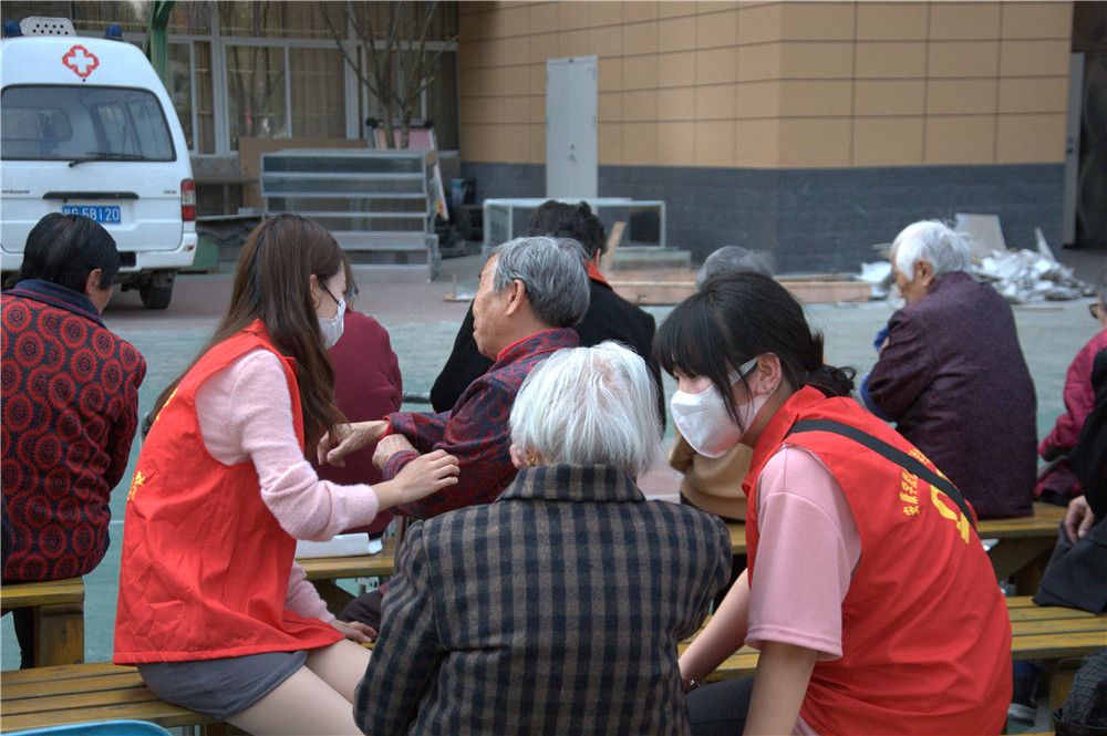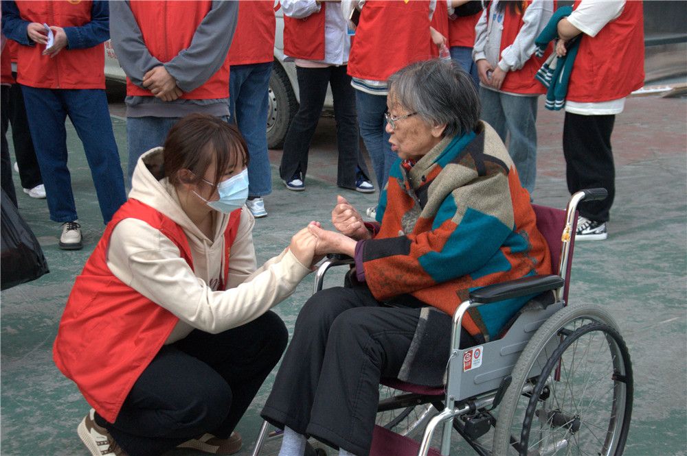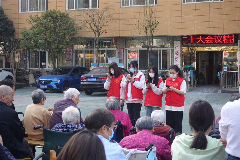 志愿者们于图书馆门前集合,成三路纵队,有组织有纪律地步行前往阳光爱心护理院。志愿者们的到来给平日清净的敬老院带来阵阵欢笑声,院内洋溢着温馨、祥和的气氛。他们热情地问候老人,为老人送上诚挚的祝福。志愿者们有的陪老人聊天,询问其身体和生活状况;有的为老人捏肩捶背,做些力所能及的事情;有的则在一旁进行节目排练。老人们也一一询问志愿者们所学的专业以及未来的职业发展,希望同学们年少应有为,为国家、为社会作出更大的贡献。