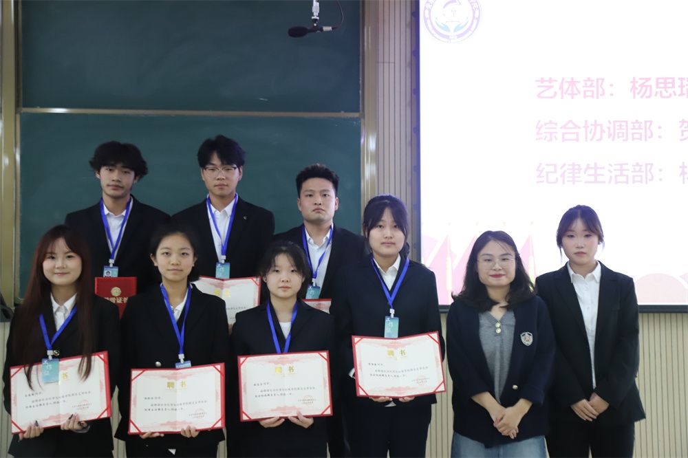 10月15日下午,365上市集团官网在江北校区1号教学楼1405室举行第37届团总支、员工会成立大会暨受聘仪式。公司党总支副书记沈菲、学工办副主任寇静媛、辅导员谢德安、全体员工干部参加会议。会议由团总支书记成沛锐主持。