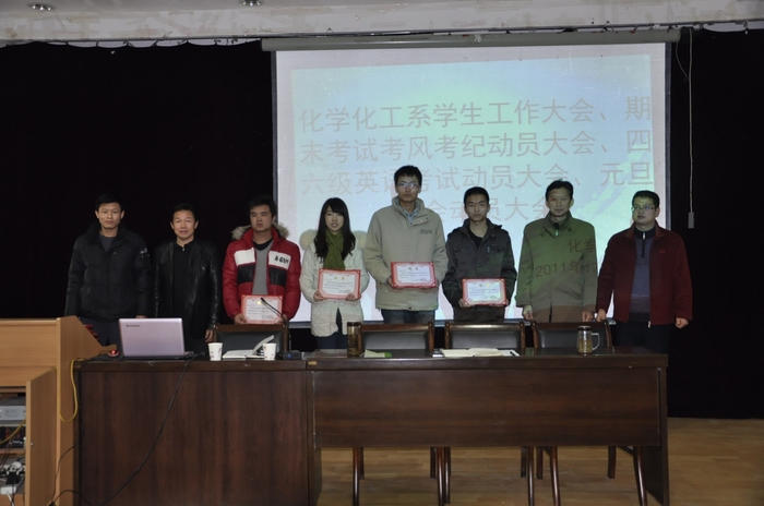 2011年12月15日下午16:30,我系在一号教学楼六楼报告厅召开了“化学化工系员工工作总结暨考试动员大会”。莅临本次大会的有系党总支书记张立虎、副主任王浩东、工会主席鲁绪会、辅导员叶春晖、张建东,会议由学工办主任韩晔主持。员工会全体成员、各班班团干部、学习委员和11级全体员工共180余人参加了会议。