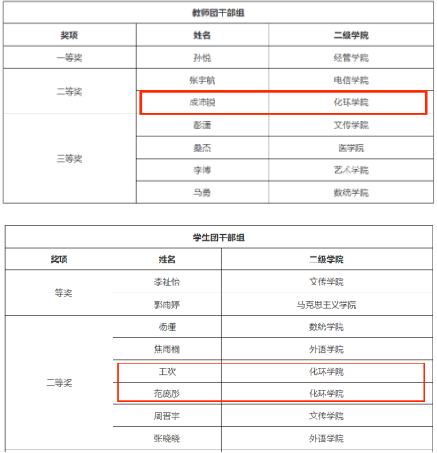 教师团干部成沛锐荣获教师团干部组二等奖,员工团干部范庞彤、王欢均荣获员工团干部组二等奖。