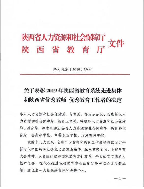 近日,陕西省人社厅、教育厅联合下发《关于表彰2019年陕西省教育系统先进集体和陕西省优秀教师 优秀教育工作者的决定》(陕人社发〔2019〕39号),公司教师黄婷荣获“陕西省优秀教师”荣誉称号。