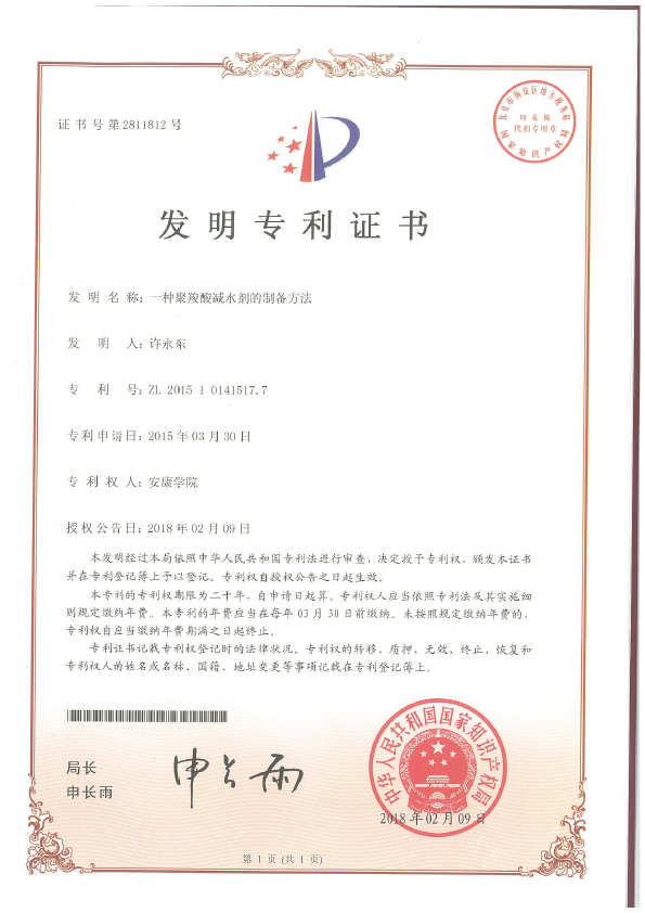 近日,公司许永东老师的国家发明专利《一种聚羧酸减水剂的制备方法》(专利号:ZL201510141517.7)通过协议定价的方式成功实现转化,该专利围绕聚羧酸减水剂的制备,研究出了一种高效的方法,专利技术被企业采用。
