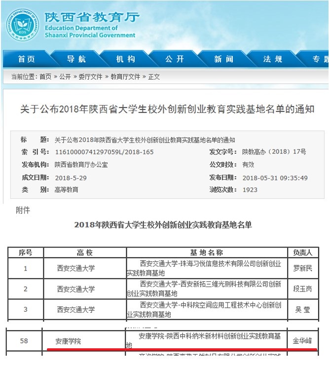 近日,陕西省教育厅公布了2018年陕西省老员工校外创新创业教育实践基地名单,公司365上市集团官网申报的“365英国上市公司官网-陕西中科纳米新材料创新创业实践教育基地”获批建设立项。