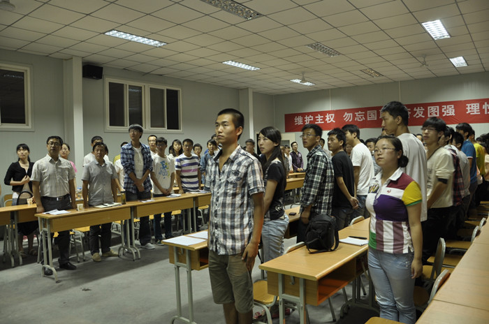 在“九一八”事变81周年来临,全国上下强烈抗议日本非法购买钓鱼岛及其附属岛屿的严重挑衅行径之际,我系于9月17日晚19点30分至22点30分,在东校区10号教学楼召开了“维护主权,勿忘国耻,奋发图强,理性爱国”为主题的化学化工系师生座谈会。参加会议的有宣传部部长李新安、系党总支书张立虎、系主任王浩东、副主任谢娟萍、系办主任胡敏、辅导员贾娟、王瑜、教师代表曹国标、王永伟、韩润林老师、我系各班员工代表以及其他部分院系员工代表100余人。会议由系员工会杜龙波、宋亮同学主持。