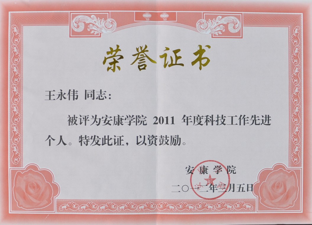 我系化学工程工艺教研室主任王永伟同志被评为2011年度科技工作先进个人。