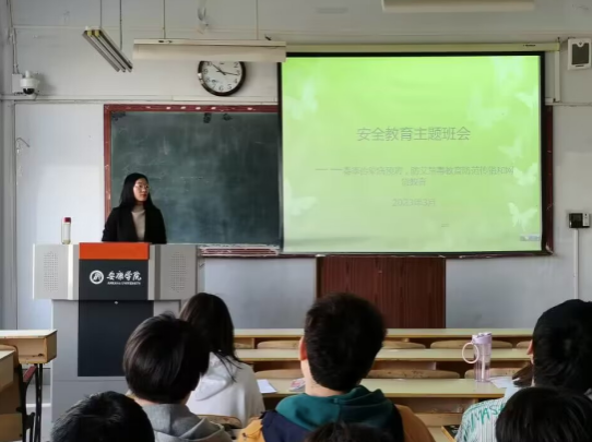 最后,成沛锐老师向同学们提出建议,指出要切实保障人身安全;保证自身饮食安全养成良好的卫生习惯;积极维护财产安全,坚决不押任何证件;注意维护网络安全;着力确保消防安全学习相关逃生知识;有效维护交通安全,提高交通安全意识。