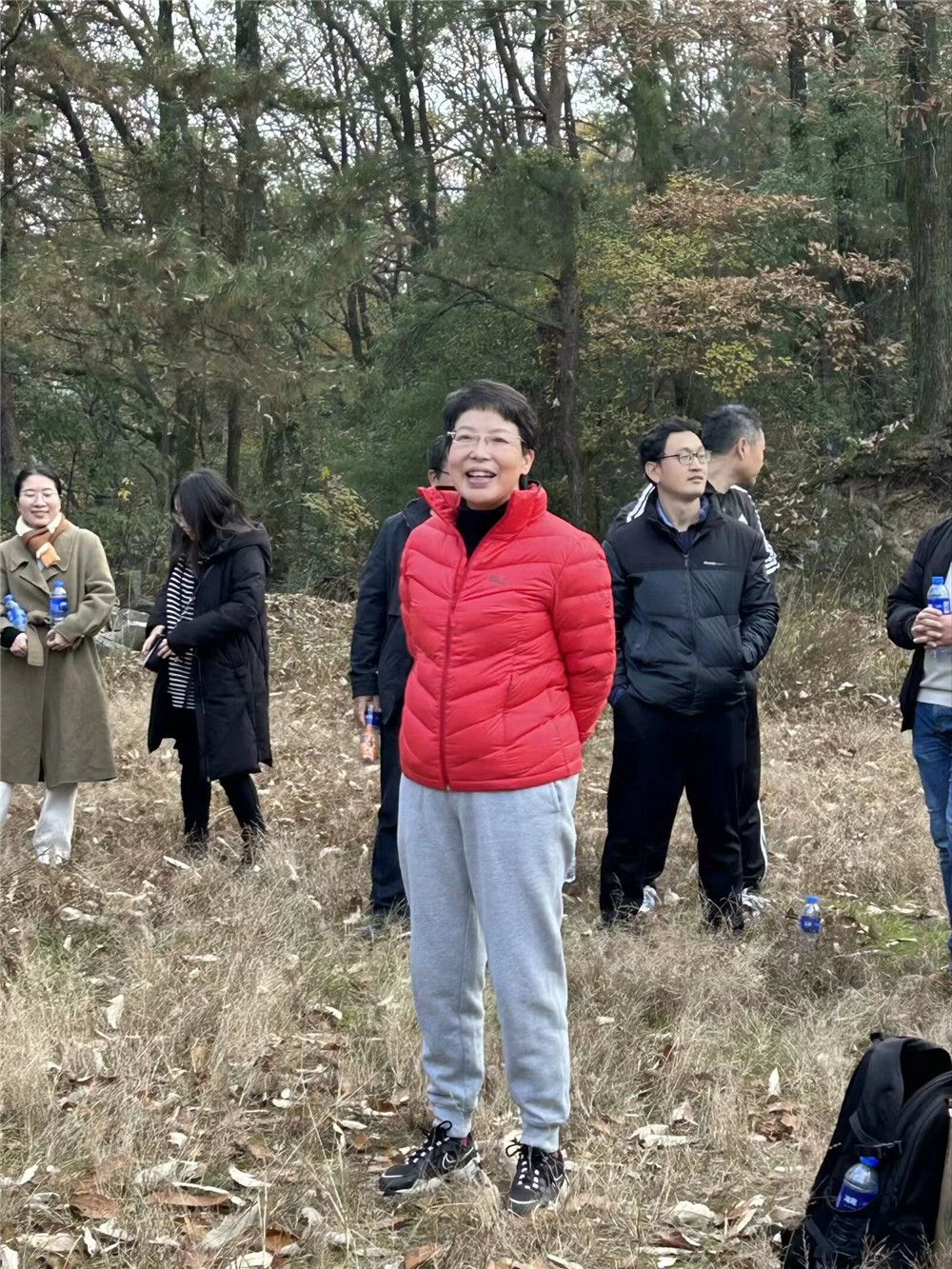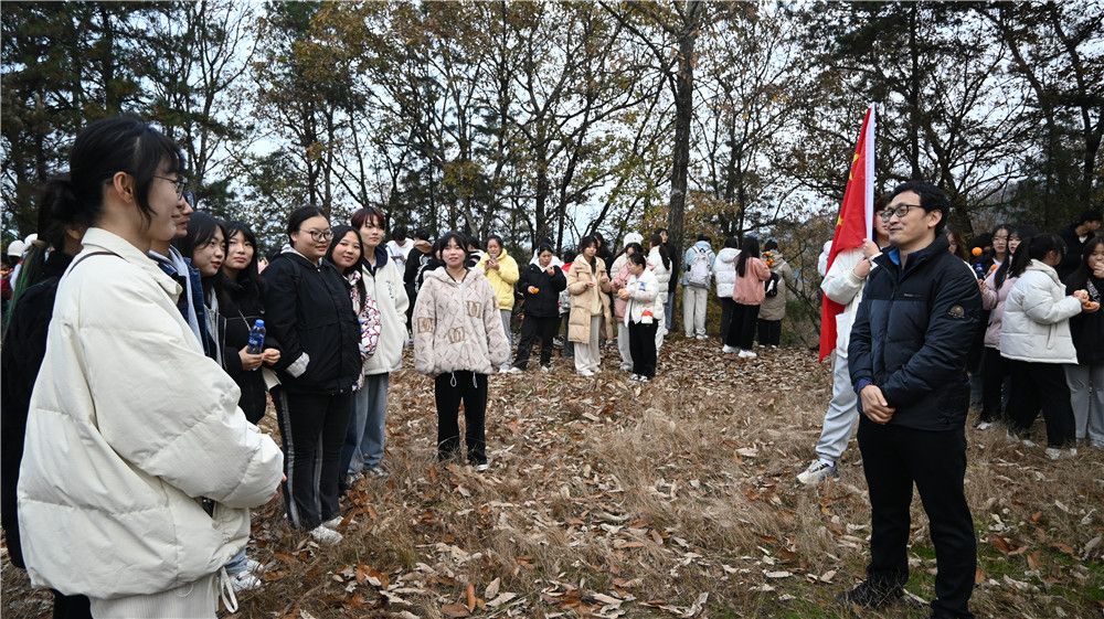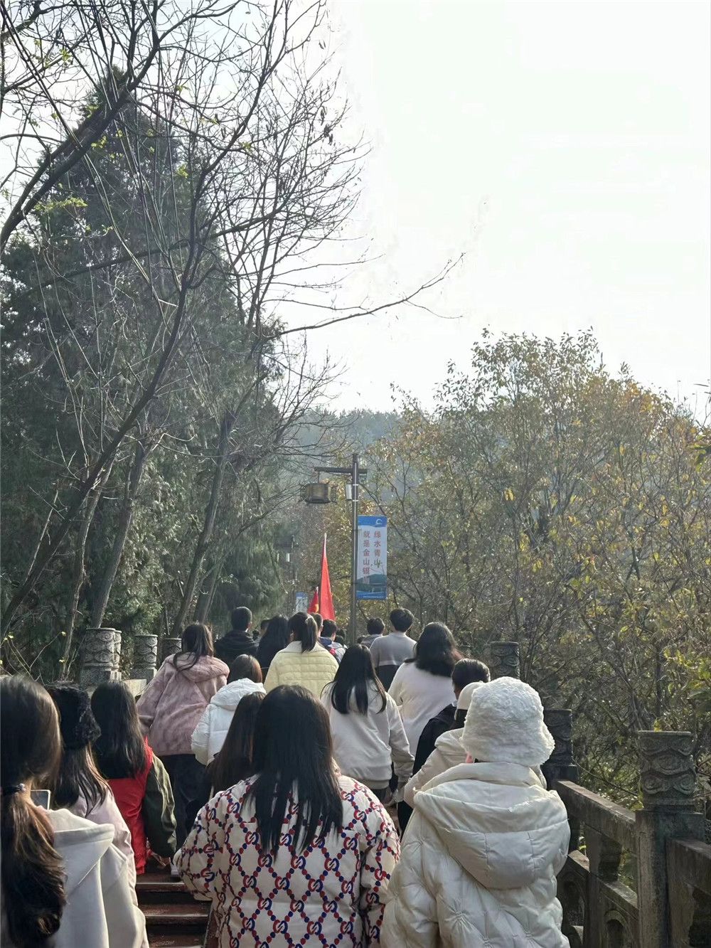 12月1日下午2点,全体员工在老师们的带领下从图书馆门前集合出发,一路上高举旗帜有序前进,旅途中大家欢声笑语,唱歌拍照,欣赏着香溪步道沿途的美景。历经一个多小时的徒步爬山后,全体师生到达了目的地。