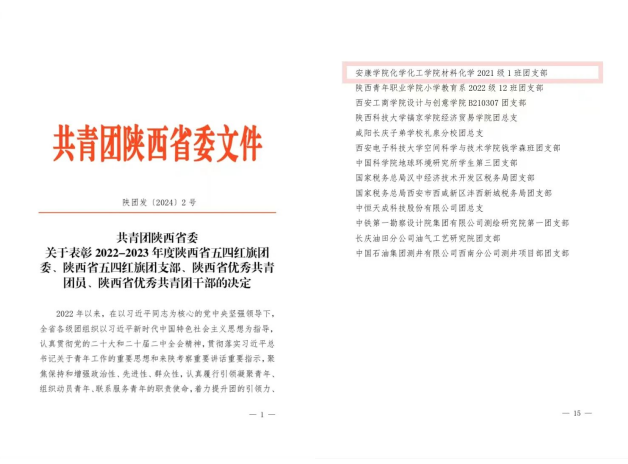 近日,根据《共青团陕西省委关于表彰2022-2023年度陕西省五四红旗团委、陕西省五四红旗团支部、陕西省优秀共青团员、陕西省优秀共青团干部的决定》的文件精神,表彰了2022—2023年以来,在全省共青团工作和事业发展中的先进典型。