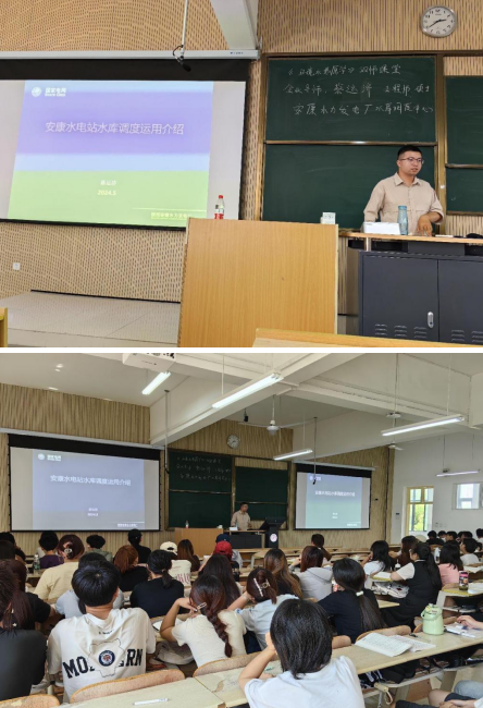 蔡老师结合自身工作实际,从汉江上游流域及安康水电站概况、水库调度运用方案、洪水调度实例、发电经济运行调度等多个方面给同学们讲授了汉江上游降雨-径流的形成关系特点,解析了安康水库在汉江上游如何发挥防洪、发电、供水、航运、生态等综合效益。并通过对2023年“9.19”、“9.29”汉江上游两场洪水精细化调度过程的讲解,展现了安康水库如何通过水情会商、错峰滞洪、梯级联合调度等方式充分利用洪水资源、实现防洪-发电双赢的局面。蔡老师丰富具体、有深度、有见解的语言为同学们还原了水利人与洪水相较量、保卫安康城区免受洪涝灾害的生动画面,赢得了同学们的阵阵掌声。
