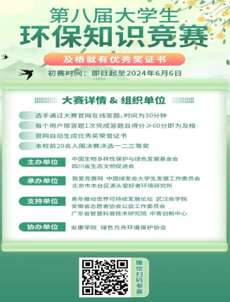 为积极响应“6·5”世界环境日号召,绿色方舟环境保护协会配合“中国生物多样性保护与绿色发展基金会”、“四川省生态文明促进会”举办第八届全国老员工环保知识竞赛,活动采用网络知识竞赛的方式普及环保知识,选手通过大赛官网在线答题,时间为30分钟,每个用户限答题1次完成答题且得分≥60分即为及格。该活动让更多同学关注环境变化,呼吁大家重视环境问题,与自然共生,与生态互助。