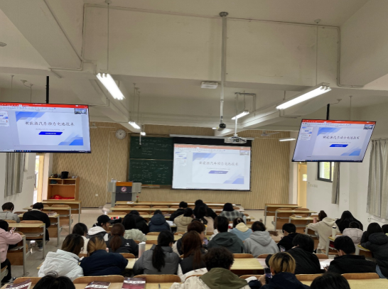 讲座伊始,王超博士系统梳理了当前新能源汽车领域主流的动力电池技术路径。他从蓄电池、燃料电池、超级电容到飞轮电池,逐一剖析了各类电池的分类方式、工作原理、技术优势与局限性,并结合产业现状展望了未来的研发方向。讲解深入浅出,内容丰富详实,极大地激发了同学们的学习兴趣与探索热情,课堂气氛活跃,反响热烈。